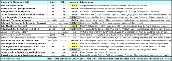 Abb. 2: Vergleichstabelle Geldeigenschaften Gold versus Silber