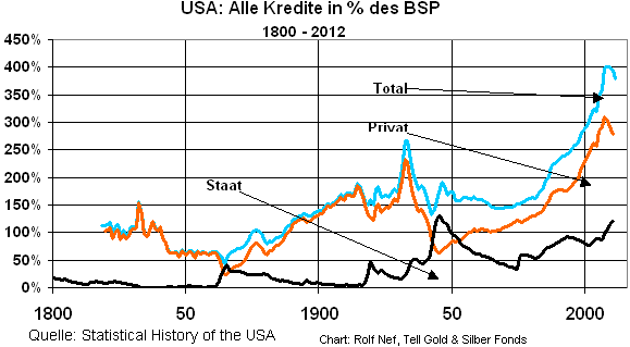 Die Verschuldung der USA im privaten und öffentlichen Sektor ist bestens bekannt (Grafik 1). Das Total aller US Kredite beläuft sich aktuell auf etwas weniger als 60 Trillionen US$ (1 Trillion sind 1'000 Mrd.) und wächst noch immer, besonders die Bundesschuld, die gegenwärtig bei ca. 17 Trillionen liegt. Kürzlich hat der Kongress die Schuldenobergrenze bis 2015 aufgehoben, so dass bis 2015 ungehindert und unlimitiert weiter Schulden aufgetürmt werden können.