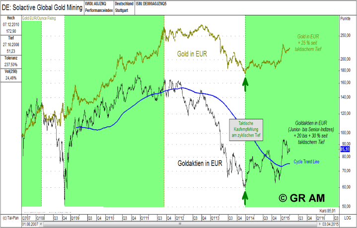 Abb. 1: Goldminen und Goldpreis in EUR von 08/2007 bis 03/2015
