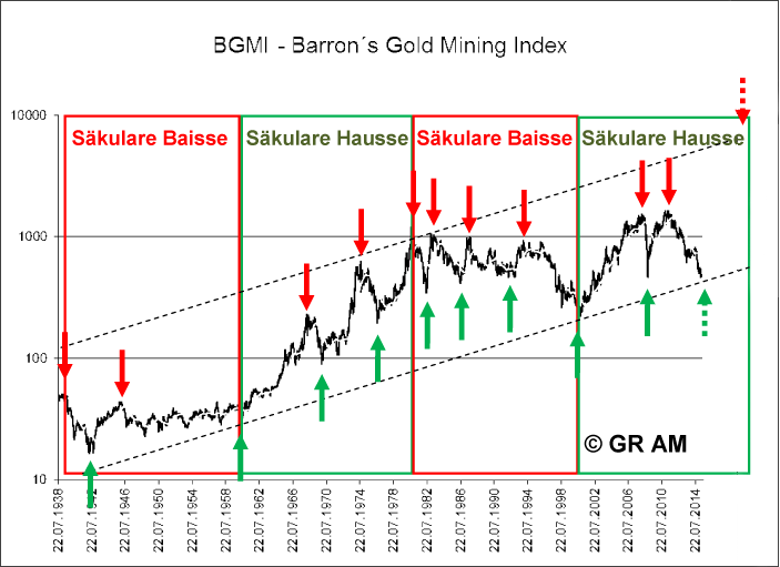 Abb. 2: BGMI (Barron´s Gold Mining Index) in USD von 07/1939 bis 03/2015