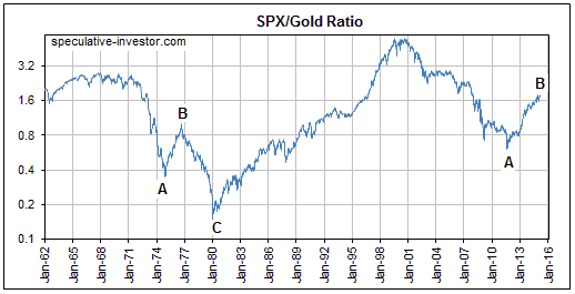 Die Fixierung des Goldpreises in den 1960ern erschwert auch andere direkte Vergleiche, so einen Vergleich des S&P 500:Gold-Verhältnisses ab Ende der 1960er Jahren bis Anfang 1980 mit dem gleichen Verhältnis ab 1999-2001 (in beiden Fällen handelte es sich um langfristige S&P-Bärenmärkte). Hätte der Goldkurs frei schwanken können, so hätte sich das SPX/Gold-Verhältnis höchstwahrscheinlich in den 1960ern in einem Abwärtstrend befunden und nicht jene leichte Aufwärtstendenz gezeigt, die wir im folgenden Chart sehen.