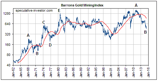 Bei einer solche Betrachtung darf man aber Folgendes nicht vergessen: Das Kursmuster der 1970er war zum Teil durch die Eliminierung jener Fortschritte geprägt, die sich ansonsten schon Anfang bis Ende der 60er Jahre manifestiert hätten, wäre der Goldpreis nicht fixiert gewesen. Dieser ‘fehlende‘ Fortschritt der 1960er an den physischen Goldmärkten ist deutlich im Chart des Barrons Gold Mining Index (BGMI) zu erkennen, der gleich unter dem Gold-Chart abgebildet ist.