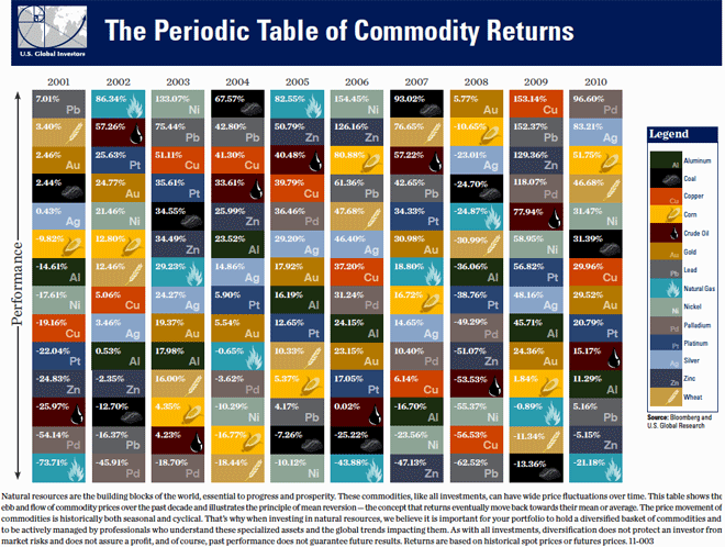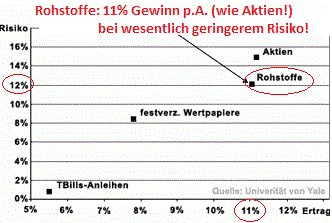 Jedoch hat die US-amerikanische Universität Yale berechnet und empirisch bewiesen, dass Rohstoffe mit durchschnittlich 11% im Jahr langfristig etwa genauso hohe Gewinne abwerfen wie Aktien - aber: bei einem geringeren Risiko. Diese Berechnungen stammen aus dem Jahr 2004 - also zu einer Zeit, als der Rohstoffboom erst am Anfang stand und die wirklich starken Preisanstiege erst noch bevorstanden.