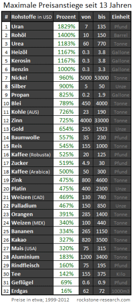 Rohstoffe haben nach dem Platzen der Internetblase Ende des 20. Jahrhunderts eine Renaissance erlebt. Der neue und langfristige Aufwärtstrend begann bei den meisten Rohstoffen Ende der 1990er Jahre und währt mittlerweile nun schon knapp 15 Jahre. In dieser Zeit vervielfachten sich die meisten Rohstoffpreise stark. Die folgende Tabelle zeigt die Preisanstiege (in der Spitze) einzelner Rohstoffe seit 1999: