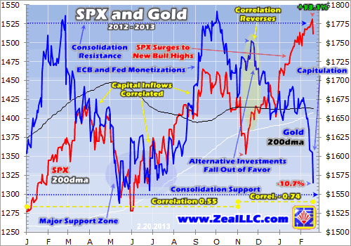 Während Gold die ultimative Investitionsalternative darstellt, sind die weithin bekannten Aktienmärkte die ultimative konventionelle Investitionsmöglichkeit. Im Chart sind der Goldpreis und der SPX von 2012 bis 2013 abgebildet. Bis November 2012 bestand eine positive Korrelation zwischen Gold und dem SPX. Sowohl Gold als auch der SPX profitierten zu denselben Zeitpunkten von Kapitalzuflüssen und sie erlebten für gewöhnlich auch gleichzeitig einen Sell-Off.