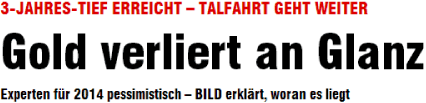 Die BILD (23.12.2013) zumindest ist sich aber schon sicher, dass der Goldpreis auch 2014 fallen und der Glanz weiter abblättern wird: