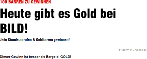 Wir erinnern uns kurz zurück: Am 11. August 2011 - also nur wenige Wochen vor dem Allzeithoch bei 1.921 USD - verloste BILD Goldbarren. Damals hieß es noch, dass Gold besser als Bargeld ist.