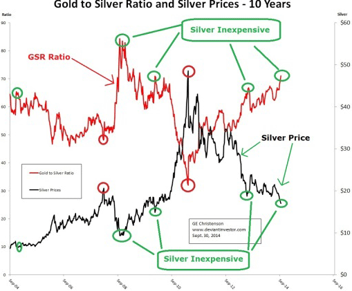 Betrachten Sie das GSV der letzten zehn Jahre und vergleichen Sie die Extreme des Verhältnisses mit den Böden und Spitzen des Silberpreises.