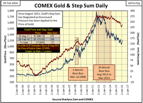 Die Weigerung der Optimisten, ins Lager der Pessimisten überzulaufen, war vollkommen verständlich. Der einzige Grund für den Abwärtstrend der Gold- und Silberpreise waren die Manipulationen an den Terminmärkten - den Bullen und vielen anderen, z. B. der US-amerikanischen Regulierungsbehörde CFTC, war das bewusst. Innerhalb der ersten 30 Monate der Korrekturbewegung gab die rot eingezeichnete Stufensumme nicht nach und bildete so die bearishe Box-Formation.
