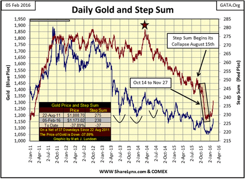 Chartanalysen sind immer subjektiv, sie stellen eher eine Kunstform, als eine Wissenschaft dar. Es gibt zwei Interpretationsmöglichkeiten hinsichtlich des Zeitpunkts, an dem das Sentiment (die Stufensumme) begann einzubrechen und die Bullen aufgaben und ebenfalls zu Bären wurden. Eine davon habe ich im folgenden Chart durch den Stern im März 2014 gekennzeichnet, als die Stufensumme ihren Höchstwert erreichte und dem Goldpreis anschließend 23 Monate lang auf dem Weg nach unten folgte.
