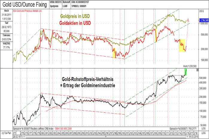 Obwohl die fundamentale Vorlaufindikation, das Verhältnis des Goldpreises (Umsatzfaktor der Minenindustrie) zu den Rohstoffpreisen (Hauptkostenfaktor neben den wenig schwankenden Löhnen), weiterhin in seinem säkularen Trend nach oben verläuft und sogar neue All-Time-Highs generiert hat, brachen die Goldminen auf unerklärliche Weise von 2013 bis 2015 aus dem Trend nach unten aus.