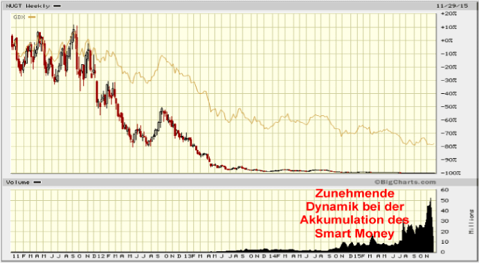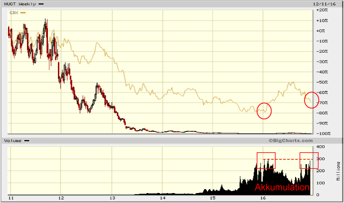 Genau vor einem Jahr, im Dezember 2015, publizierte ich an dieser Stelle einen Kommentar mit der Überschrift "Top-Insider bestätigt das Akkumulieren des Smart Money im Goldminensektor" (siehe untere Grafik aus folgendem Link: Goldminen-Akkumulation). In den darauffolgenden sieben Monaten stieg der Gold Miners Index GDX um über 150 Prozent. Trotz der seit August laufenden Korrektur liegt dieser Index im aktuellen Jahr noch immer mit über 50 (!) Prozent im Plus.