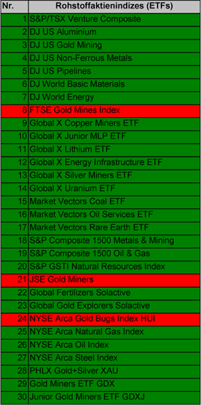 Diese, einmal wöchentlich erscheinende, markttechnische Diagnose ist ein rein systematisches Konzept auf Wochenschlusskursbasis. Hierbei werden die zyklischen Trends von verschiedenen Rohstoffaktienindizes (ETFs) tabellarisch visualisiert. Die fundamentale und verhaltensökonomische Analyse findet keine Berücksichtigung.