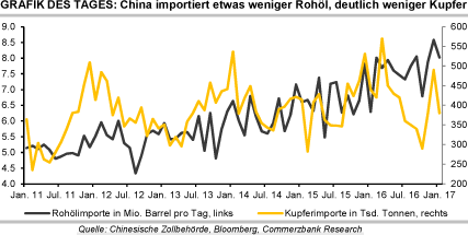 China hat heute Morgen gute Handelsdaten für Januar berichtet und gibt damit den Metallpreisen zum Wochenausklang nochmals Auftrieb. Auf übergeordneter Ebene sind sowohl die Importe als auch die Exporte deutlich gestiegen. Heruntergebrochen auf die einzelnen Segmente bzw. individuellen Rohstoffe ergibt sich ein differenzierteres Bild. So sind die Kupferimporte gemäß Daten der Zollbehörde sowohl im Vergleich zum Vorjahr als auch im Vergleich zum Vormonat spürbar auf 380 Tsd. Tonnen gesunken (um 13,6% bzw. 22,4%).