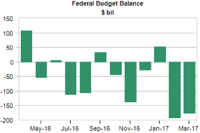 Ein höheres Defizit im Federal Budget, das für eine Teilmenge im öffentlichen Haushalt steht, fiel mit 176,2 Mrd. USD höher aus mit 167 Mrd. USD prognostiziert wurde. Im März vor einem Jahr lag der Wert noch deutlich niedriger bei 108 Mrd. USD. Besonders auffällig ist der Umstand, dass die öffentlichen Einnahmen um knapp 5% zurück ging. Dramatisch knickten die Unternehmenssteuern im Berichtsmonat um 61,3% ein.