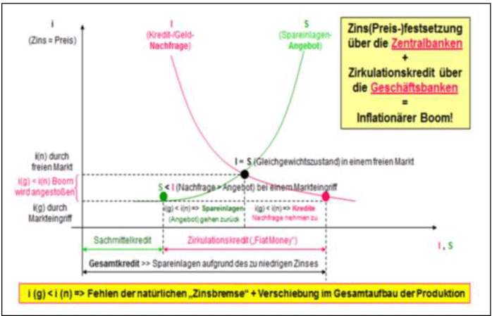 Der Eingriff der Zentralbanken in den Preisbildungsmechanismus beim Zins ("Finanzplanwirtschaft"), führte über die vergangenen Jahre und Jahrzehnte zu einer noch nie dagewesenen Bewertungsanomalie in allen Anlageklassen. Gleichzeitig kam es zu einer historisch einmaligen Allokationsverzerrung in der Realwirtschaft. Bei einer freien marktwirtschaftlichen Preisbildung, ohne staatliche Eingriffe, tendiert der Markt immer zu einem Gleichgewicht von Angebot und Nachfrage, was letztendlich zu einer sogenannten "Markträumung" führt. Aus der Güterknappheit heraus entsteht weder Mangel noch Überschuss. Wird jedoch der Preis planwirtschaftlich unter das natürliche Marktniveau gedrückt, wie dies seit Jahren beim Kreditzins der Fall ist, dann geht die Nachfrage nach Geld überproportional nach oben (führt zu Überschuldung einer Volkswirtschaft) und das Angebot, in Form von Spareinlagen, sinkt (führt zu einer negativen Sparquote). Ein Mangel an Kreditvergabe (Sachmittelkredit aus Kundeneinlagen) wäre normalerweise die Folge.