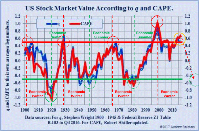 Abb. 2: Q-Ratio (Substanzbewertung - blau) versus CAPE (Ertragsbewertung - rot) von 1900 bis 2016