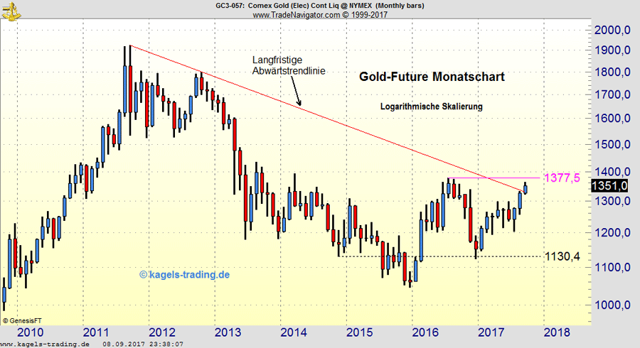Aus Sicht des Wochencharts liegt beim Gold-Future eine große Seitwärtsbewegung vor, die sich über die letzten zwei Jahre erstreckt. Der Goldpreis ist in dieser Zeit zwischen 1.045 $ (Tief von Dezember 2015) und 1.377 $ (Hoch aus dem Juli 2016) gependelt.