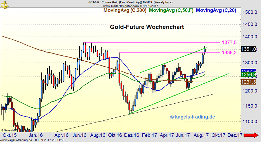 In den letzten neun Wochen konnte der Goldpreis wieder Stärke zeigen, nachdem die 1.200 $ Marke im Juli erfolgreich getestet wurde. Aus Sicht des Wochencharts liegt ein etablierter Aufwärtstrend vor, nachdem der Widerstand in der 1.300 $ Zone in der vergangenen Woche erfolgreich überwunden werden konnte.