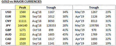 Die meisten von uns konzentrieren sich auf den Goldpreis in Dollar und in nur einem Jahr stieg dieser Goldpreis um 34%. Wenn man das auf den S&P mit 2.800 als Ausgangspunkt überträgt, würde es einer Rally um fast 1.000 Punkte in einem Jahr gleichkommen. Beim Dow Jones mit 25.000 als Ausgangspunkt entspräche es einer Rally um 8.500 Punkte. Einfach gewaltig. Doch das ist nicht der interessanteste Aspekt des Anstiegs von Gold.