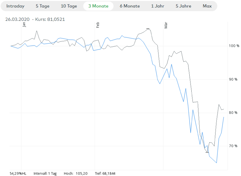 Die letzten vier Wochen waren bei Silber derart volatil, nervenaufreibend und spannend wie zuletzt zur Finanz- und Wirtschaftskrise 2008/09. Der Crash an den Aktienmärkten bei DAX, Dow Jones & Co. wirkte sich auch direkt und zeitnah auf den Silberpreis aus. Die Jahreshochs aus dem Februar und die bisherigen Jahrestiefs unter 12 USD trennen sage und schreibe 38 Prozent! Kann der jüngste Anstieg zurück auf über 14 USD bereits die positive Trendwende sein? Interessanter Weise hat der Dow Jones (blau) ab seinem Jahreshoch im Februar auch ziemlich genau 38 Prozent verloren! Lediglich die jüngst einsetzende und laufende Erholung setzte gegenüber Silber ein paar Handelstage zeitverzögert ein. In der Summe ist beiden Märkten, zumindest in Bezug auf die letzten Wochen, ein auffallend paralleler Gleichschritt zu erkennen.