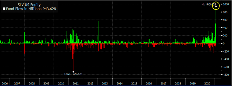 Vielleicht ändern sich aber die Meinungen der Bank-Analysten noch, so z.B. mit folgender Meldung: Am späten Freitagabend kam die Meldung herein, dass der Silber-ETF (USA: SLV) an nur einem Tag einen Zufluss von 943,62 Millionen USD bekam, was fast eine Milliarde US-Dollar sind. Somit verzeichnete der Silber-ETF den größten Zufluss aller Zeiten!