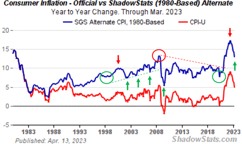 Abb. 2: US-CPI offizielle Daten (rote Linie) versus alternative Berechnung (blaue Linie) wie vor 1983