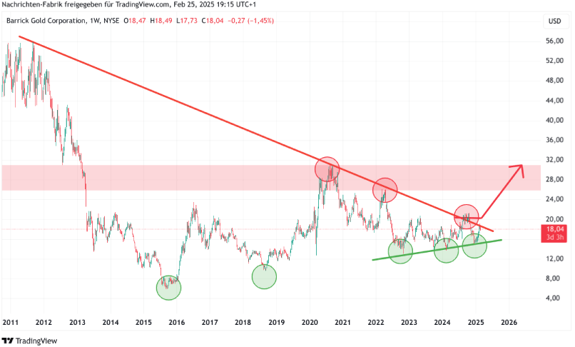 Im Wochen-Chart sah Barrick Gold in der letzten Analyse am 24. September 2024 "Barrick Gold - Planen die Bullen endlich den großen Ausbruch?" bereits bullisch und nach einem Ausbruch gen Norden aus. Ein paar Monate später ist jedoch offensichtlich, dass die große rote Abwärtstrendlinie seit dem Jahr 2011 sich erneut - ähnlich im April 2022 - als massives Hindernis dargestellt hat. Nach einem Fake-Ausbruch, der Barrick bis zum Oktober zeitweise auf über 21 USD hievte, sackte der Kurs wieder auf fast 15 USD in sich zusammen.