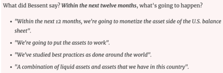 Kehren wir an dieser Stelle zu der Erklärung im Oval Office vom 3. Februar zurück. Noch einmal: Was sagte er? "Wir werden die Aktivseite der US-Bilanz monetarisieren und die Aktiva zum Arbeiten bringen."