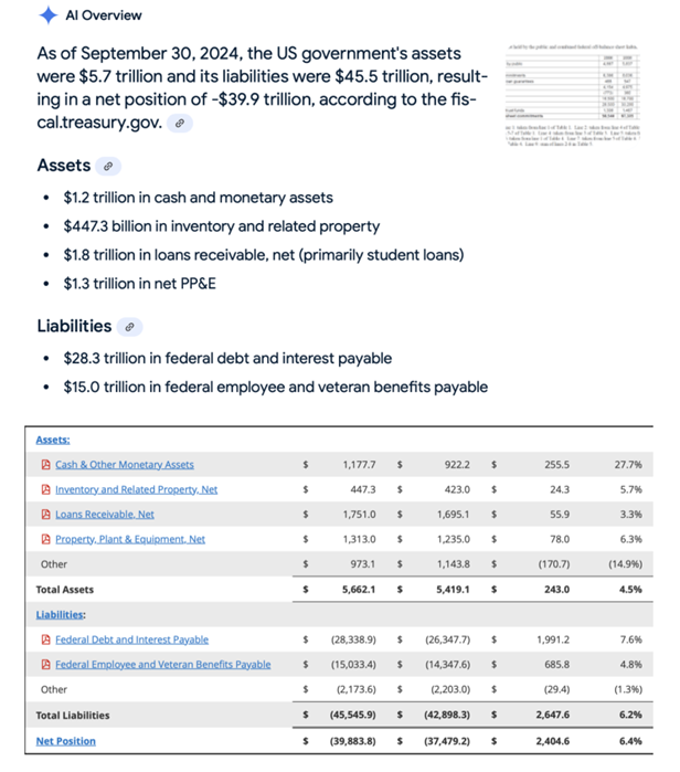 Nochmals: Ich sage nicht, dass die USA dies tun müssen oder sollten. Ich nehme den US-Ministerpräsidenten nur beim Wort: "Wir werden die Aktivseite der US-Bilanz monetarisieren und die Aktiva zum Arbeiten einsetzen." Mit welchen "Vermögenswerten" kann er also arbeiten, da eine Neubewertung des Goldes angeblich "nicht das ist, was er im Sinn hat"? Hier ist ein weiterer offizieller Chart des US-Finanzministeriums zusammen mit einer Zusammenfassung von KI: