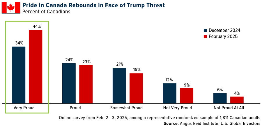 Spulen wir bis heute vor, und wir sehen einige unheimlich ähnliche Trends, angefangen mit einer Zunahme des kanadischen Stolzes. Aufgrund der antagonistischen Rhetorik von Präsident Donald Trump haben die Kanadier die US-Nationalhymne während eines Eishockeyspiels ausgebuht, und eine aktuelle Umfrage zeigt, dass der kanadische Stolz seit Dezember 2024 um 10 Punkte gestiegen ist.