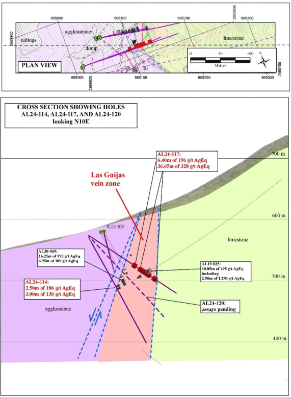 Wie im obigen Querschnitt zu sehen, wurden zuvor unterhalb dieses Treffers einmal 16,25 Meter mit 193 g/t AgEq und 6,95 Meter mit 189 g/t AgEg getroffen. Darunter nochmals 2,5 Meter mit 186 g/t AgEq und 3 Meter mit 130 AgEq. Die Bohrung AL24-120 wurde abgeschlossen, doch die Auswertungen stehen noch aus.