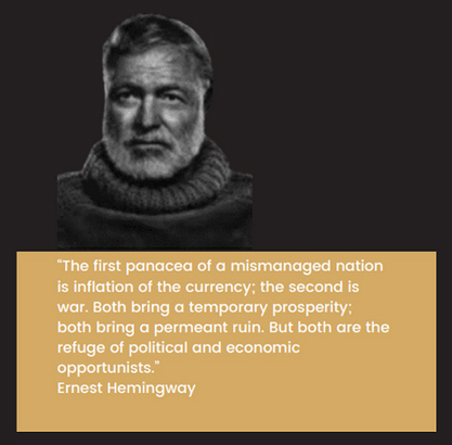 "Das erste Allheilmittel schlecht verwalteter Nationen ist Währungsinflation. Das zweite ist Krieg. Beide bringen vorläufig Wohlstand, beide bringen dauerhaft Ruin. Und beide sind der Rückzugsort für politische und wirtschaftliche Opportunisten." - Ernest Hemingway