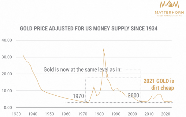 Abschließend noch das Diagramm unten, das beweist, dass Gold im Verhältnis zum US-Geldangebot immer noch so billig ist wie in den Jahren 1970 und 2000. Bitte ignorieren Sie nicht diese einmalige! Chance, Ihr Vermögen zu schützen und eine Anlage zu besitzen, die zudem noch erhebliches Vermögenszuwachspotential hat. Kaufen Sie Gold.