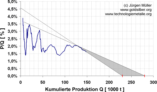 Abbildung 1: Hubbert-Linearisierung für Gold und sinnvolle Extrapolationen in die Zukunft [5]