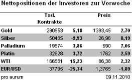 Die Daten zeigen noch einmal deutlich, dass die Kursverluste in der Vorwoche definitiv durch den Abbau von Positionen an den Terminmärkten verursacht wurden, welche teilweise durch dortige Marginerhöhungen begründbar sind. Während der Anstieg nachhaltig war, sind für den Rückgang die spekulativen Kräfte verantwortlich. Bei allen Edelmetallen, mit Ausnahme von Platin, sind die Zeichen für weitere Anstiege positiv. Besonders stabil und nachhaltig scheint der starke Preisanstieg bei Silber zu sein.Die Schwäche des Euro wurde mit einer Halbierung der Long-Positionen erkauft. Der Euro konnte sich somit weiter gut behaupten. Letztlich bleibt wieder nur zu sagen, dass die relativ hohen Positionen der Spekulanten in den Edelmetallen einen weiteren Anstieg der Preise grundsätzlich nicht stützen, aufgrund der fortgeschrittenen Marktphase aber auch nicht im Weg stehen. Der leichte Rückgang der Long-Positionen der vergangenen Monate im Silber bei gleichzeitig gestiegenen Preisen ist sogar extrem positiv zu werten. Lediglich Platin zeigt schon seit längerer Zeit eine relative Schwäche, weshalb die Preisentwicklung im Vergleich zu den anderen Edelmetallen erst einmal unterproportional sein sollte.