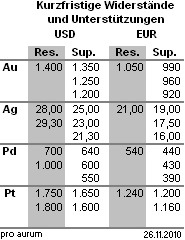 Vier Wochen nach Eröffnung unserer Lokation in Dresden ist ein reges Interesse an pro aurum und deren Produktpalette zu registrieren. Auf 8 Käufer kommt dabei zurzeit ein Verkäufer. Trotz der starken Volatilität nutzen viele Anleger die Chance, noch einmal zu günstigeren Konditionen nachzukaufen. Die nicht sehr ermutigenden Nachrichten aus Irland und Südeuropa lassen berechtigte Sorgen über die Zukunft des Euro mit in die Kaufentscheidungen einfließen.