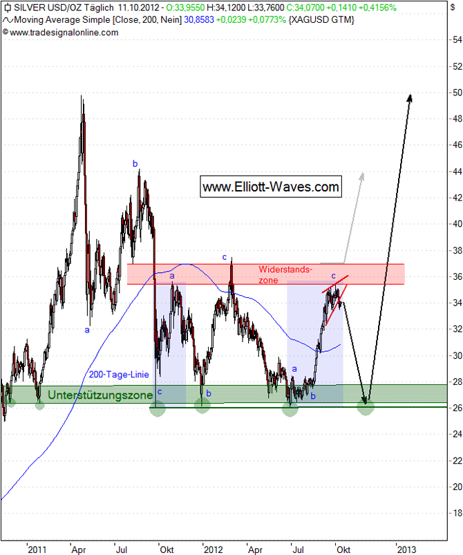 - 3. Widerstand und Unterstützung. Auf die mehrmonatige Unterstützungszone etwas über 26 USD, die schon Anfang 2011 ihren Ursprung hat, bin ich an dieser Stelle schon mehrfach eingegangen. Es dürfte schon mit dem Teufel zugehen, wenn dieses „Brett“ bricht! Neu ist hingegen die Widerstandszone zwischen 35,40 und 37 USD, die sich langsam aber sicher zu formieren scheint. Innerhalb dieses Bereichs dürfte und wird es Silber sehr schwer haben, weiter Boden gut zu machen.