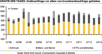 Gold tritt bei 1.725 USD je Feinunze auf der Stelle. Der heute Morgen vom World Gold Council veröffentlichte Bericht für das dritte Vierteljahr brachte teilweise überraschende Erkenntnisse. Die Gesamtnachfrage hat zwar dank einer starken ETF-Nachfrage im dritten Quartal in Höhe von 136 Tonnen gegenüber dem zweiten Quartal um 10% zugelegt, lag damit aber 11% niedriger als im Vorjahr. Unerwartet schwach war die Nachfrage nach Münzen und Barren. Sie verharrte mit 294 Tonnen auf dem Vorquartalsniveau und lag damit 30% unter dem Vorjahreswert. Es enttäuschte dabei vor allem die europäische Nachfrage.