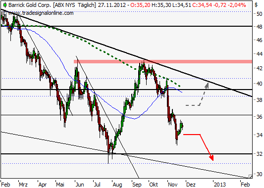 Am 12. Oktober wurde bereits darauf hingewiesen, dass beim kanadischen Goldminenkonzerns Barrick Gold Corp. mögliche Rücksetzer drohen. Unterhalb der Marke von 39,00 USD setzten schließlich auch eben solche ein und ließen den Titel bis 36,00 USD zurückfallen. Dort am ehemaligen Widerstand angekommen versuchte sich die Aktie zwar an einer Stabilisierung, doch dieser Versuch war nur von kurzer Dauer. Weitere Details folgen im nächsten Absatz.