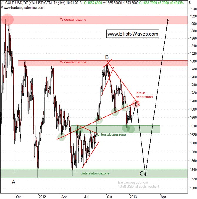Zitat vom 10. Januar: „Kurzfristig sehe ich allerdings steigende Kurse im Rahmen einer Gegenreaktion. Natürlich nicht wegen der „Hammer“-Kerze, sondern, weil ich den Kreuzwiderstand, den ich schon am 26.12.2012 im Rahmen der Analyse "Gold in 2013 bei 10.000 USD?" beschrieben hatte, gerne noch einmal getestet haben möchte. Das Kursziel sehe ich in den kommenden Tagen bei ca. 1.700 USD.