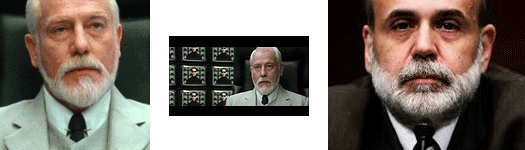 Die faschistischen Vereinigten Staaten sind die Verkörperung der MATRIX (aus dem gleichnamigen, mehrteiligen Kinohit der späten 1990ern). Achten Sie auf die Ähnlichkeiten zwischen dem nüchtern-kühl kontrollierenden Architekten dieser parallelen Scheinwelt (links) und dem US-Fed-Chef Ben Bernanke (rechts). Erschreckend. Helmut Bakaitis, der österreichische Schauspieler, der den Architekten verkörperte, soll damit aber als Allerletzter beleidigt werden. In den Spielfilmen bekämpfte er Nero, das Orakel und den nervigen Schlüsselmacher. Sie stehen für die Gold-Community, die auf eine Befreiung von der Matrix hinarbeitet und sich eine Schlacht mit einer korrupten, kontrollierten Fiat-Währungsmatrix liefert, in deren Kern der US-Dollar steht, der von US-Staatsanleihen-Software (Bankenderivate) sowie anderen Banken-Computerkonsolen verteidigt wird.