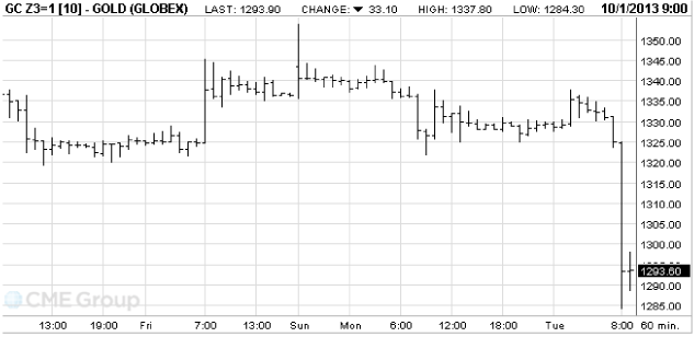Die Edelmetalle Gold und Silber kamen heute am frühen Nachmittag schlagartig unter Druck. Wie aus dem Nichts heraus verlor der Goldpreis mehr als 50 US-Dollar innerhalb von Minuten. Den Tagesverlauf sehen Sie nachfolgend im 5-Minuten-Chart: