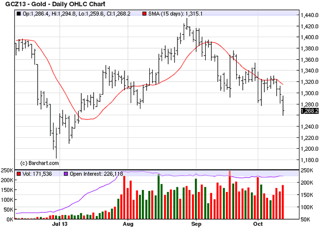 Einige könnten meinen, dass es sich hierbei eher um Agenda-Setzung von oben handelt, als um akkurate Prognose. Was immer auch zutrifft, die Analysten haben den Trend auf ihrer Seite und Trader sollten vorsichtig sein, deren Analysen als falsch abzutun. Der Goldkurs (auf Basis der Dezember-Futures) befindet sich weiterhin unter seinem 15-Tage-Durchschnitt (siehe oben), und das sagt uns, dass der zwischenzeitliche Trend immer noch nach unten zeigt. Solange dieser Abwärtstrend nicht mit Entschiedenheit durchbrochen wird, solange dürften die Verkäufer die Kontrolle behalten.