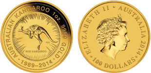Anlässlich des 25-jährigen Jubiläums der "Australian Kangaroo" ist nun auch eine 1-oz-Münze mit diesem traditionellen Motiv erhältlich. Neben dem klassischen Schriftzug und den Angaben zu Feingewicht und Reinheit sind auch die Jahreszahlen "1989-2014" sowie das Beizeichen "P25" aufgeprägt. Auf der Kehrseite der Münzen sind Königin Elizabeth II, die aktuelle Jahreszahl und der Nennwert der Münze von 100 Dollar abgebildet.