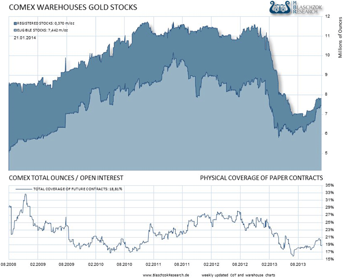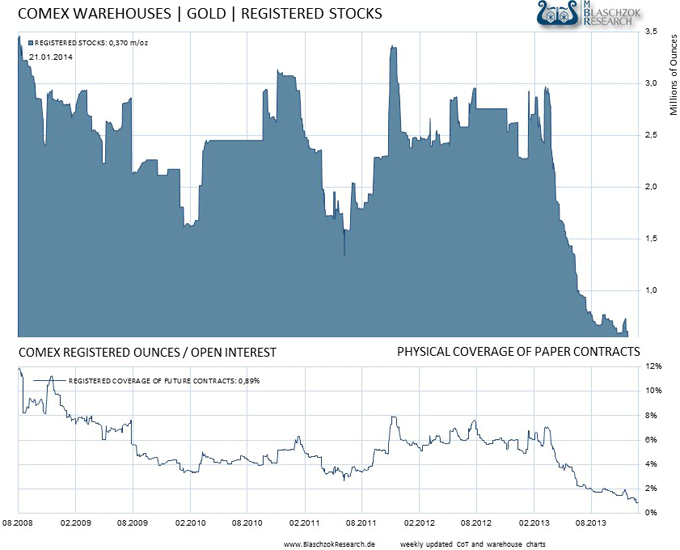 In den letzten Tagen werden zurecht die COMEX-Lagerhäuser thematisiert, da die registrierten physischen Bestände ein neues Rekordtief erreicht haben. Diese sind auf 370 Tsd. Unzen gesunken, womit die Futures Kontrakte nur noch zu 0,89% gedeckt sind. Das bedeutet, dass theoretisch 112 Personen ein Bezugsrecht auf eine Unze Gold hätten, wenn jeder die physische Aulieferung verlangen würde. Wie Sie wissen, beobachten wir diese Bestände ständig und stellen wöchentlich die aktualisierten Charts dazu kostenlos auf unserer Homepage dem interessierten Investor zur Verfügung. (www.BlaschzokResearch.de/cot )