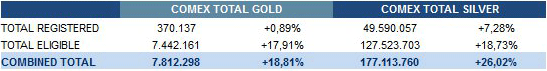 Ich halte es daher für sehr unwahrscheinlich, dass es zu einem "Failure" am Terminmarkt kommt in diesem Jahr, wie ihn einige diesen bereits kommen sehen. Für das Bankenkartell oder die herrschenden Regime erschließt sich mir einfach kein Vorteil, wenn die COMEX zusammenbrechen und der Goldpreis in die Höhe schießen würde. In der Vergangenheit war es nämlich immer so, dass "Eligible" Bestände in den Lagerhäusern einfach auf die registrierten Bestände umgebucht wurden und so Lieferverpflichtungen stets erfüllt wurden. Auf unserer Homepage finden Sie auch die eligiblen Bestände und die langfristigen Charts dazu.