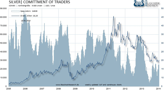 Die aggregierten Bestände an der COMEX zeigen eine Deckung von 18,8%, womit auf jeden Kontrakt nur 5 Besitzer kommen und im Silber gar nur vier. Quelle: www.BlaschzokResearch.de/cot