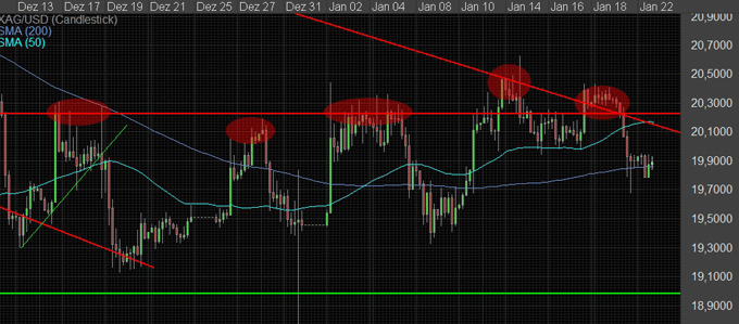 Der Silberpreis wurde die letzten beiden Monate jedes Mal bei 20,30 USD ausgebremst, was die Daten der US-Aufsichtsbehörde klar beweisen. Die Long-Spekulanten haben sich bereits ziemlich verausgabt, was die Gefahr birgt, dass diese ihre Long-Kontrakte plötzlich wie eine heiße Kartoffel fallen lassen und dazu übergehen könnten, auf nochmals fallende Kurse zu setzen. Andererseits könnte ein Sprung über den Abwärtstrend mit einer Bestätigung über 21,30 USD weitere Spekulanten ins Boot holen. Wir bleiben weiterhin vorsichtig nach der Manipulation der letzten beiden Monate und warten ab, da die Daten dafür sprechen, dass das Smart Money die Taschen noch nicht voll hat bei diesem Preis.