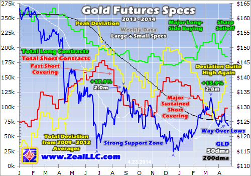 Also führten Futures-Verkäufe zu mehr Futures-Verkäufen, überschwemmten den Markt mit einem nicht abreißenden Angebot, während sich die Situation in der Ukraine bald wieder aufzuheizen begann. Und die daraus resultierende Goldschwäche zog die GLD-Anteilskurse nach unten und entfachte ungeheuren Pessimismus. Doch dieser Prozess flaut ab, da US-amerikanische Spekulanten bereits soviele Long-Goldkontrakte abgestoßen haben, dass ihre gesamten Longs nun so niedrig sind, wie sie wahrscheinlich überhaupt sein können.